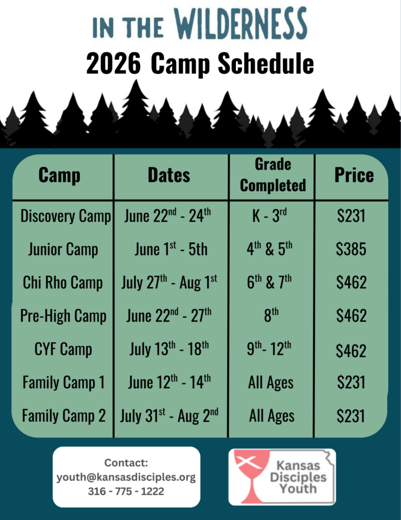 The Christian Church in Kansas (Disciples of Christ), the owner of the Disciples Center, hosts seven DOC summer camp and conference sessions each summer. Children and youth who have completed grades K-12 are invited to attend our age-appropriate sessions. Grandparents, Parents, Aunts, Uncles or other Significant Family members and their youth are invited to attend Family Camp.