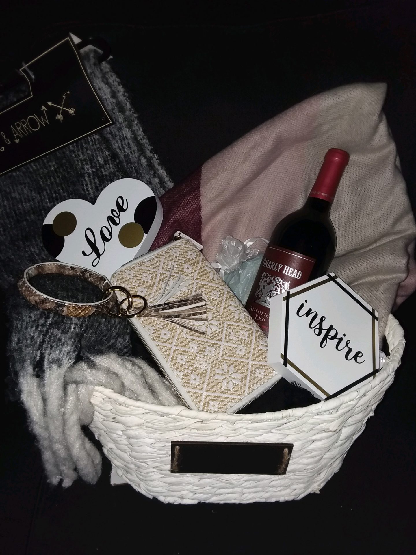 This winter, spend your evenings curled up on the couch with a good book or a movie. The basket contains: 2-shawls, bracelet, clutch, bracelet key ring, a bottle of wine, “Inspire” and “Love” wooden décor plaques.