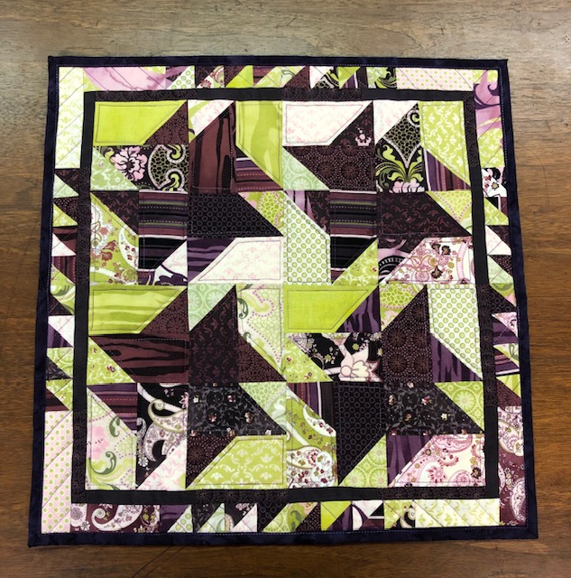 A 17-inch square purple and green machine pieced and quilted table topper.